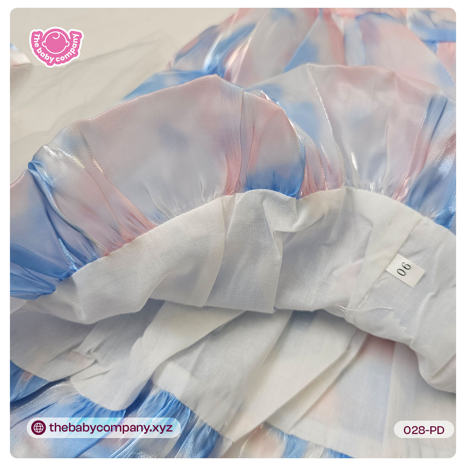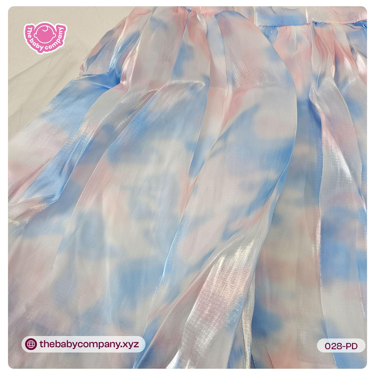 Fabric: Soft shiny organza-style outer layer with pastel rainbow color blend and layered tulle skirt