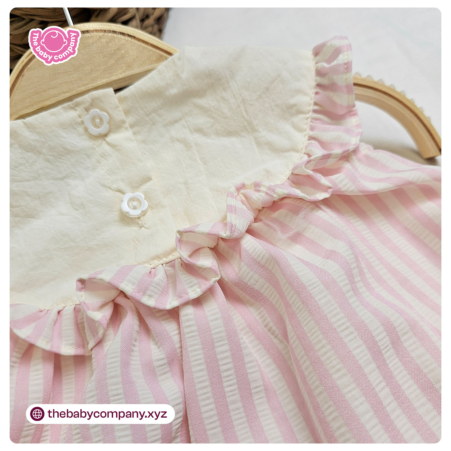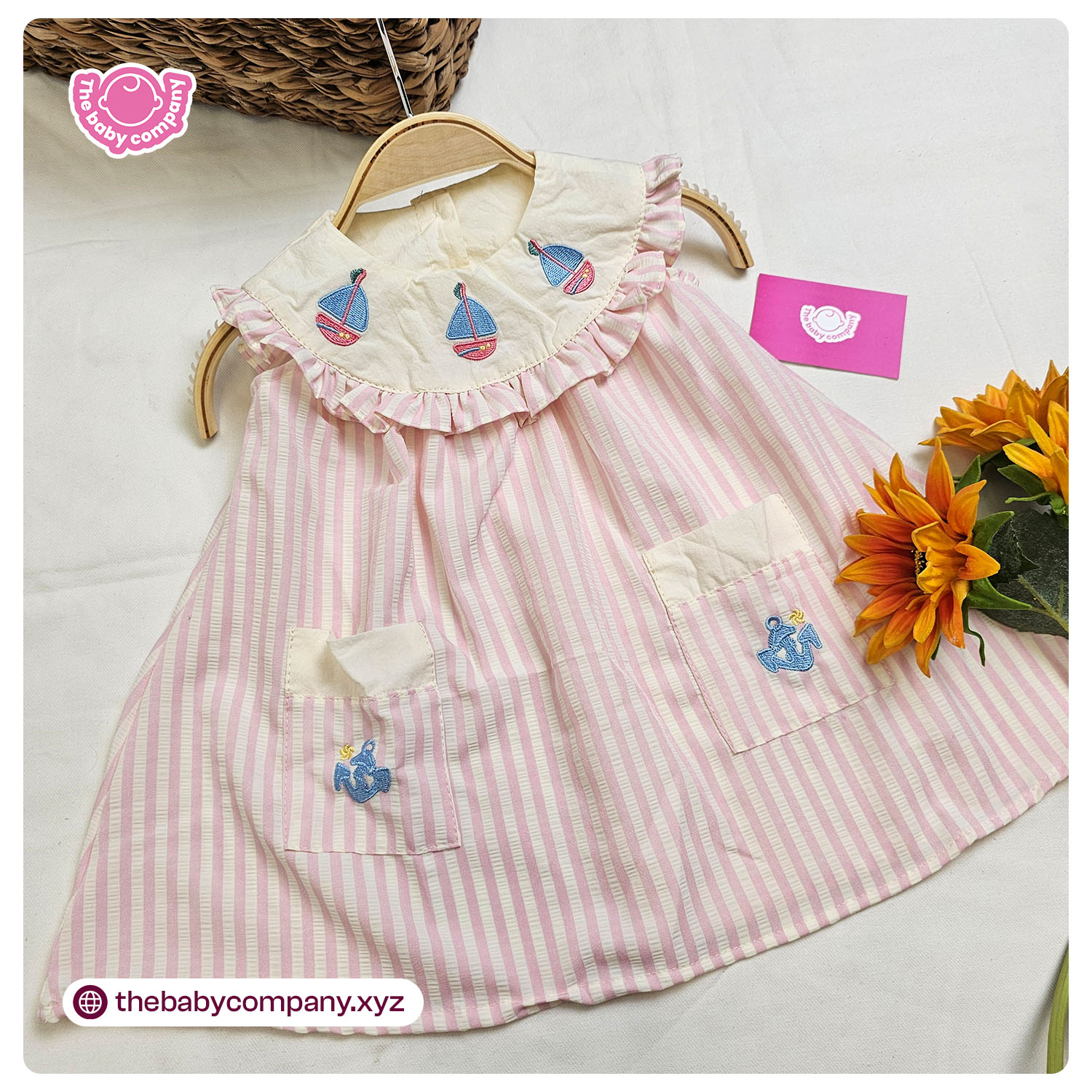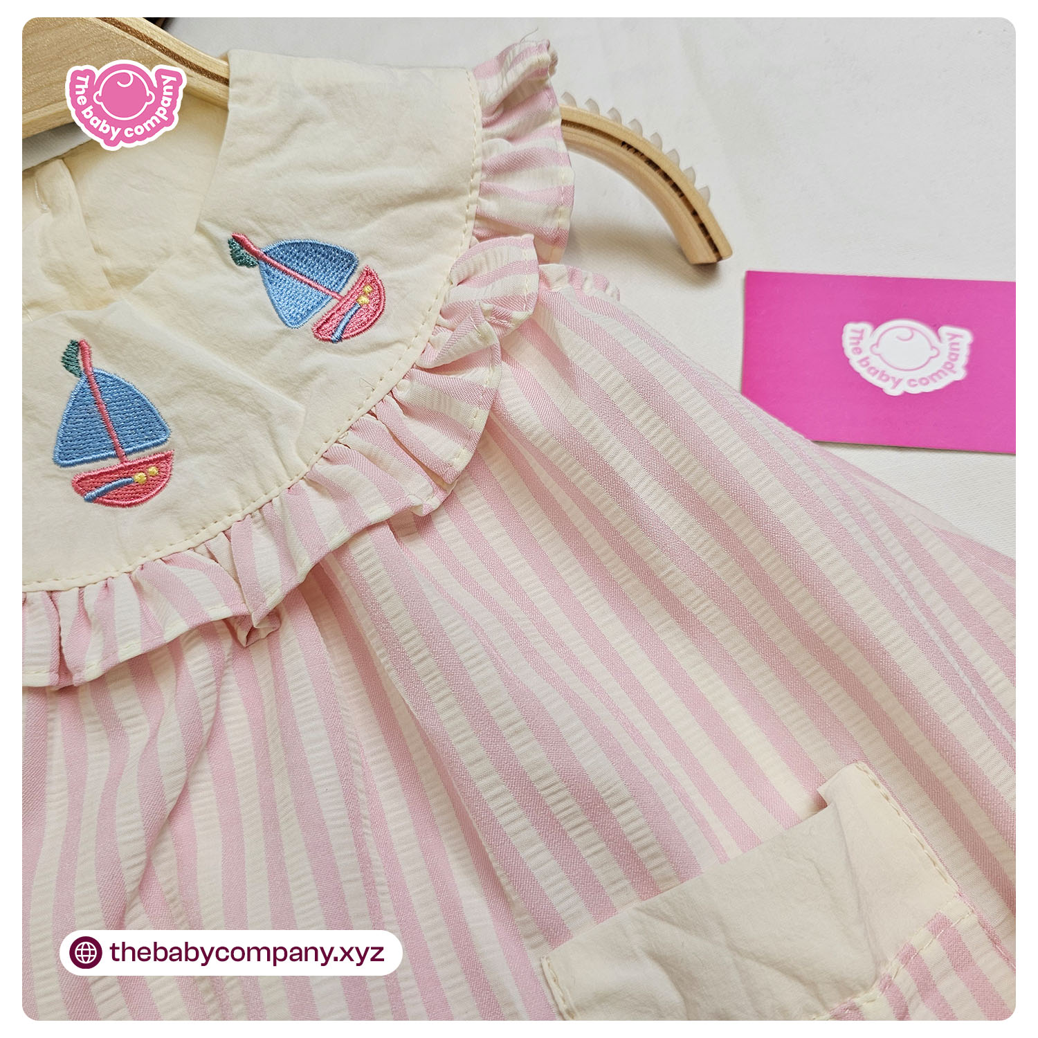 This adorable pink striped dress is designed to keep your little girl comfortable while looking cute and stylish. The soft pink and cream stripe pattern creates a fresh and playful look, while the beautifully embroidered sailboat details on the collar add a charming touch that makes the dress extra special.